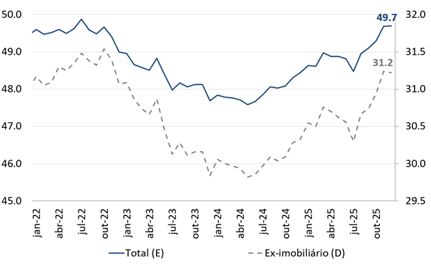 O comprometimento da renda também avançou. As operações de crédito contratadas deverão ser amortizadas ao longo do tempo, comprometendo a renda mensal dos devedores enquanto as dívidas não forem quitadas. O crescimento do comprometimento também acelerou na segunda metade de 2025, alcançando 29,3% da renda nacional disponível bruta em outubro e mantendo-se neste patamar nos meses seguintes. O comportamento do comprometimento não-imobiliário emula o observado no endividamento: mesma dinâmica geral do dado agregado, incluindo novo máximo histórico ao final de 2025, mas em patamar levemente inferior.