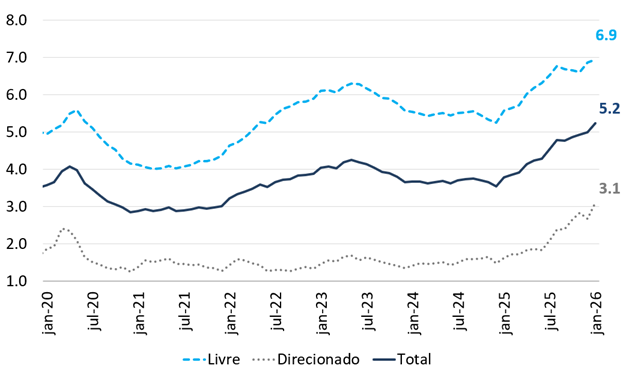 Esse cenário adverso (no endividamento, no comprometimento de renda e na inadimplência) se formou com mercado de trabalho notoriamente aquecido. A taxa de desocupação vem declinando sistematicamente deste março de 2024, atingindo um novo mínimo histórico (5,1%) ao final de 2025. Ainda que a taxa de desemprego tenha avançado marginalmente no início de 2026 (para 5,4% em janeiro), é senso comum de que ela se encontra abaixo da taxa natural de desemprego (NAIRU) – variável não-observável, com estimativas recheadas de incerteza, mas que é amplamente vista na literatura como atualmente superior a, pelo menos, 6,5%.