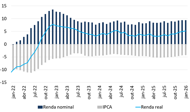 Para além dos volumes, o período recente também foi marcado por crescimento real dos rendimentos na ocupação principal. Em linha com as evidências de aquecimento do mercado de trabalho (nos volumes), o rendimento médio mensal habitualmente recebido tem apresentado crescimento interanual real desde o final de 2022, e, mais importante, com aceleração do crescimento entre o final de 2025 e o início de 2026. Desempenho equivalente tem sido observado em outras métricas de rendimentos, como a massa de rendimento real de todos os trabalhos e a renda nacional disponível restrita e bruta das famílias.