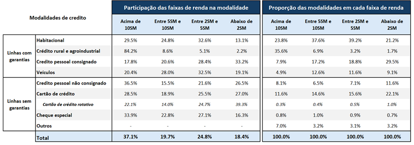 A população menos favorecida é a mais exposta à inadimplência e aos riscos de pagamento de crédito, tendo a sua saúde financeira comprometida. A população de renda mais baixa (inferior a 2 SM) responde por 18,2% do total da carteira de crédito às pessoas físicas, mas tem maior participação relativa em linhas sem garantias e com custos mais elevados, tais como no crédito pessoal não consignado (26,5%) e no cartão de crédito rotativo (39,3%). Importa destacar a elevada participação da baixa renda na modalidade de crédito pessoal consignado (33,2%), comprimindo a renda disponível, pós-descontos, dessa parcela da população. 70% da população ocupada possui renda inferior a 2 SM, de forma que parte expressiva da população se encontra, hoje, com a sua saúde financeira comprometida.